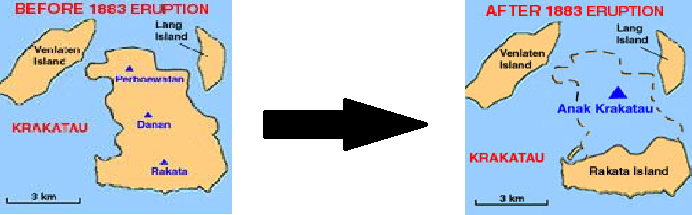 Now the original Krakatoa is split into 2 parts. The krakatoa was on a Island with 3 volcanos (see ), but that area was called Krakatoa and all the volcanos exploded. And out of the same crater, came a new volcano. The 'Anak Krakatoa', what means, 'child of Krakatoa'. A lot of people think that the original Krakatoa still exists, but then they are talking about Anak Krakatoa.
